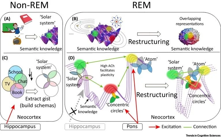 However, regardless of the heightened cerebral activity of these states, we notice that these very episodes are responsible for deeper processing of daily events and tasks that were posed earlier as being cognitively abstract and problem-like. Earlier supposedly problem-like situations and scenarios are reassessed and reprocessed cognitively piece-by-piece, not just during REM but also during the slow-wave states of dreaming, into structurally cognitive representations that we readily, even involuntarily, visualize. In a solution-based manner, these dreams of memories are reconstructed and given new meaning, if not amplified altogether (Rasch & Born, 2013).